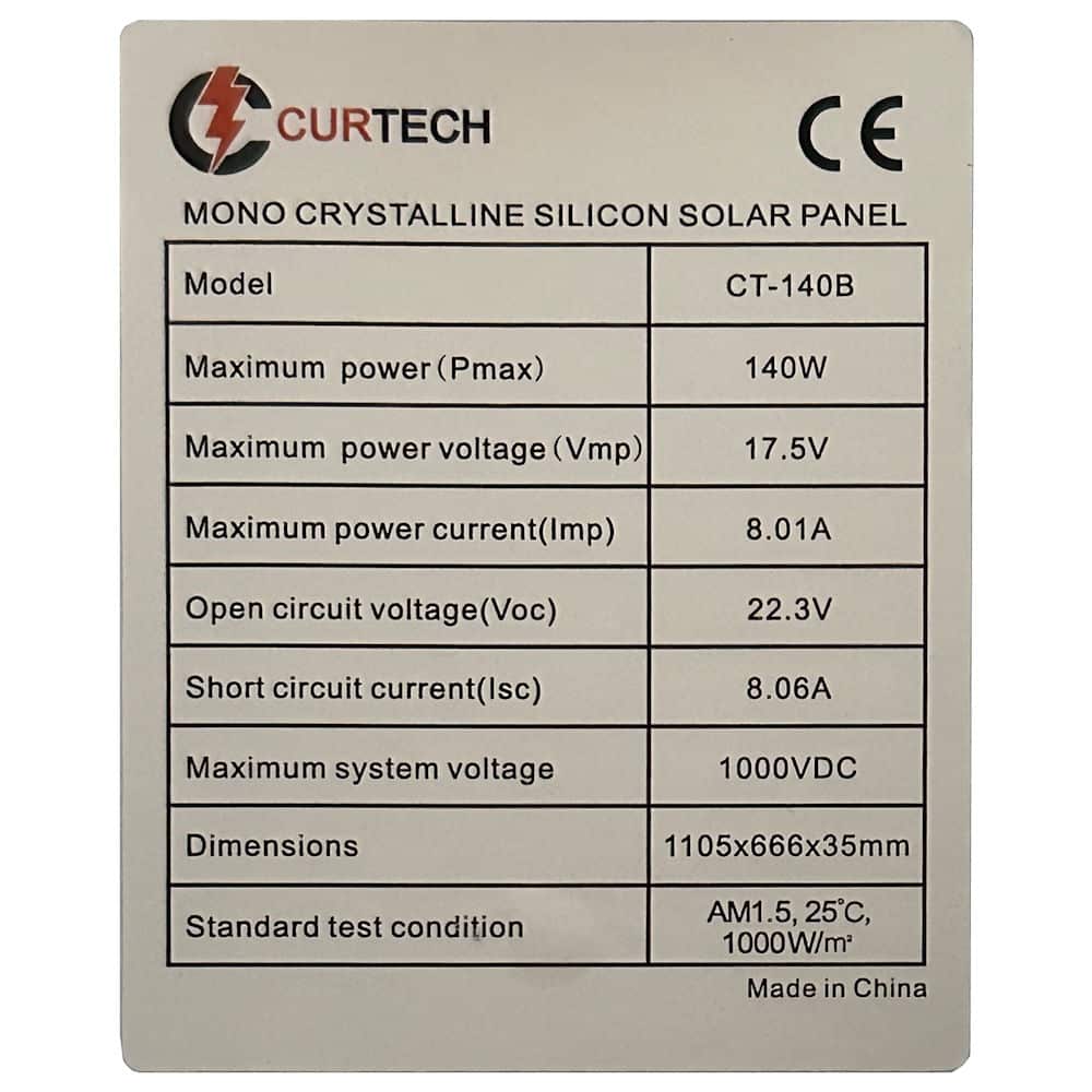 This Curtech 140W solar panel features a strong 35 mm anodised black aluminium frame and toughened glass, providing excellent durability and protection in harsh outdoor conditions.