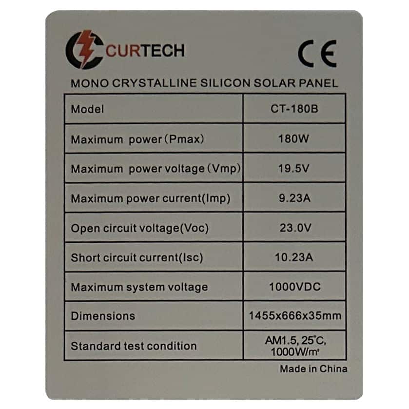 The Curtech 180W solar panel frame is constructed from strong 35 mm anodised aluminium and is now available in a sleek black finish. Toughened glass protects the solar cells, providing durability and resistance against harsh environmental conditions.